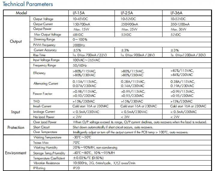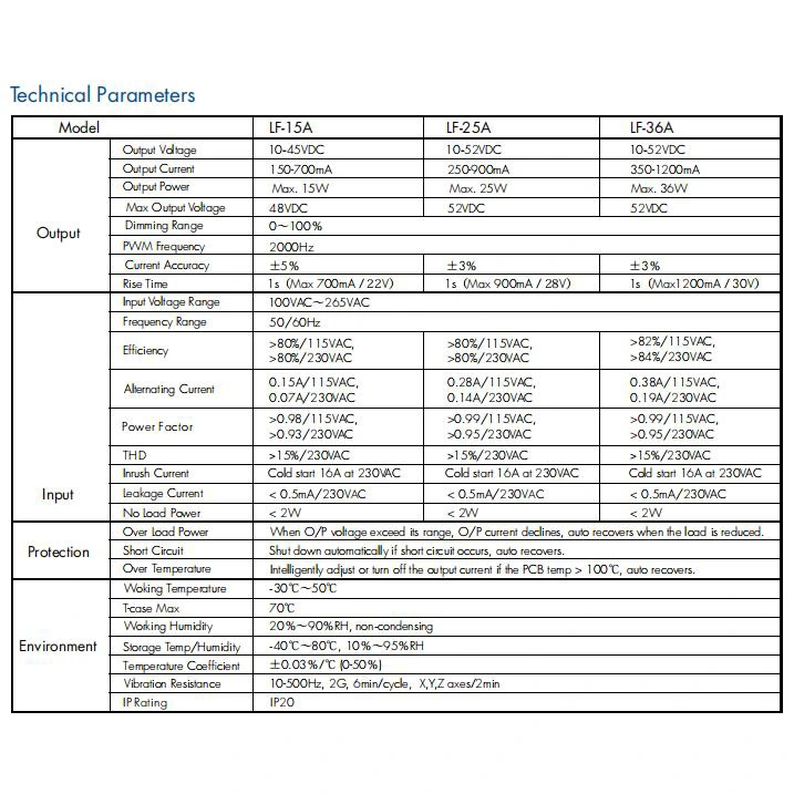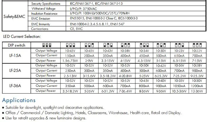 Automatisk spänningsöverensstämmelse: Föraren justerar automatiskt sin utspänning för att matcha framspänningskravet för den anslutna LED-lasten, inom dess specificerade intervall (t.ex. 12-24VDC, 20-40VDC).