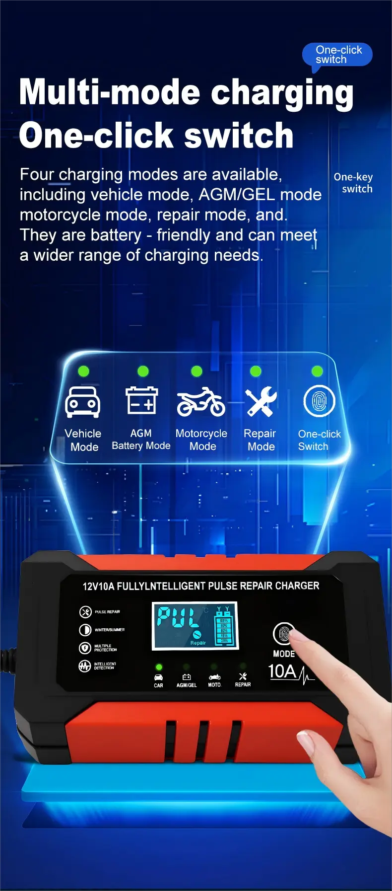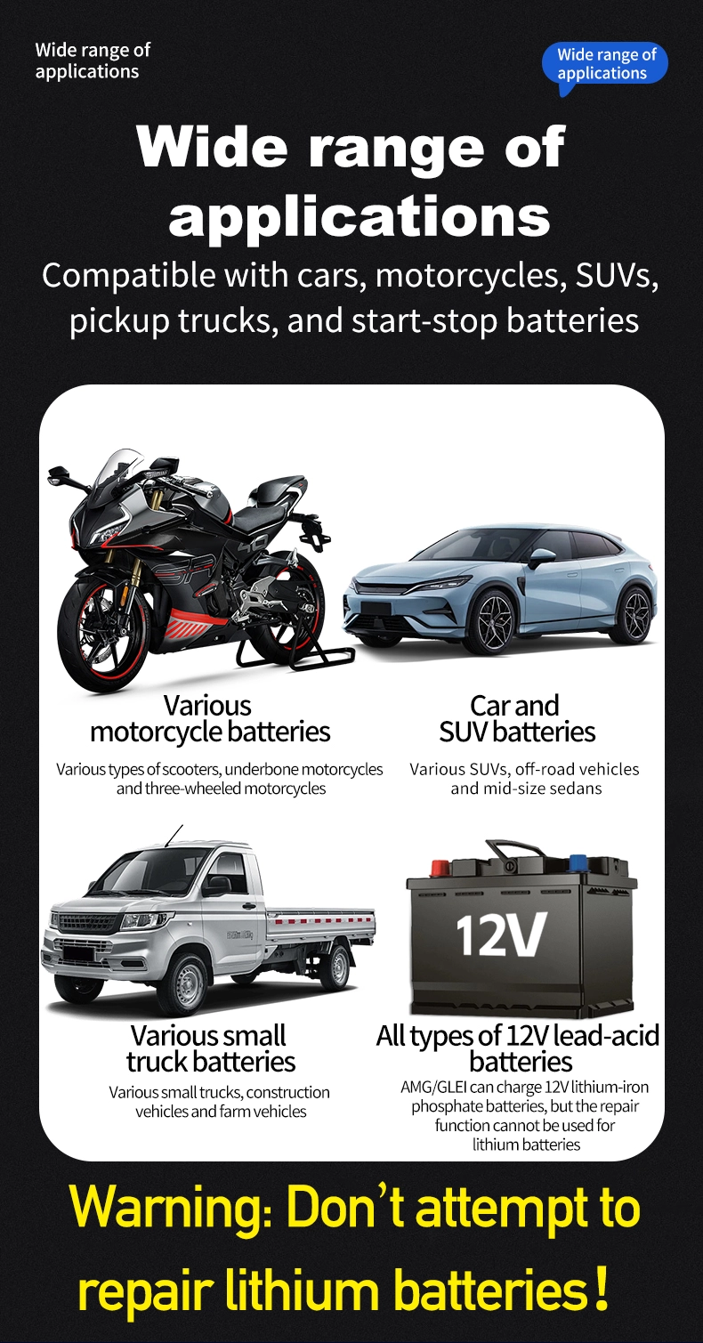 1. Universell kompatibilitet och stöd för flera batterier: Det fungerar sömlöst med alla 12V-batterityper, inklusive blysyra, AGM, Gel och LiFePO4, och täcker batterikapaciteter från 6Ah till 180Ah. Det breda ingångsområdet 110~230V eliminerar regionala begränsningar, vilket gör det användbart i över 100 länder och regioner runt om i världen.
