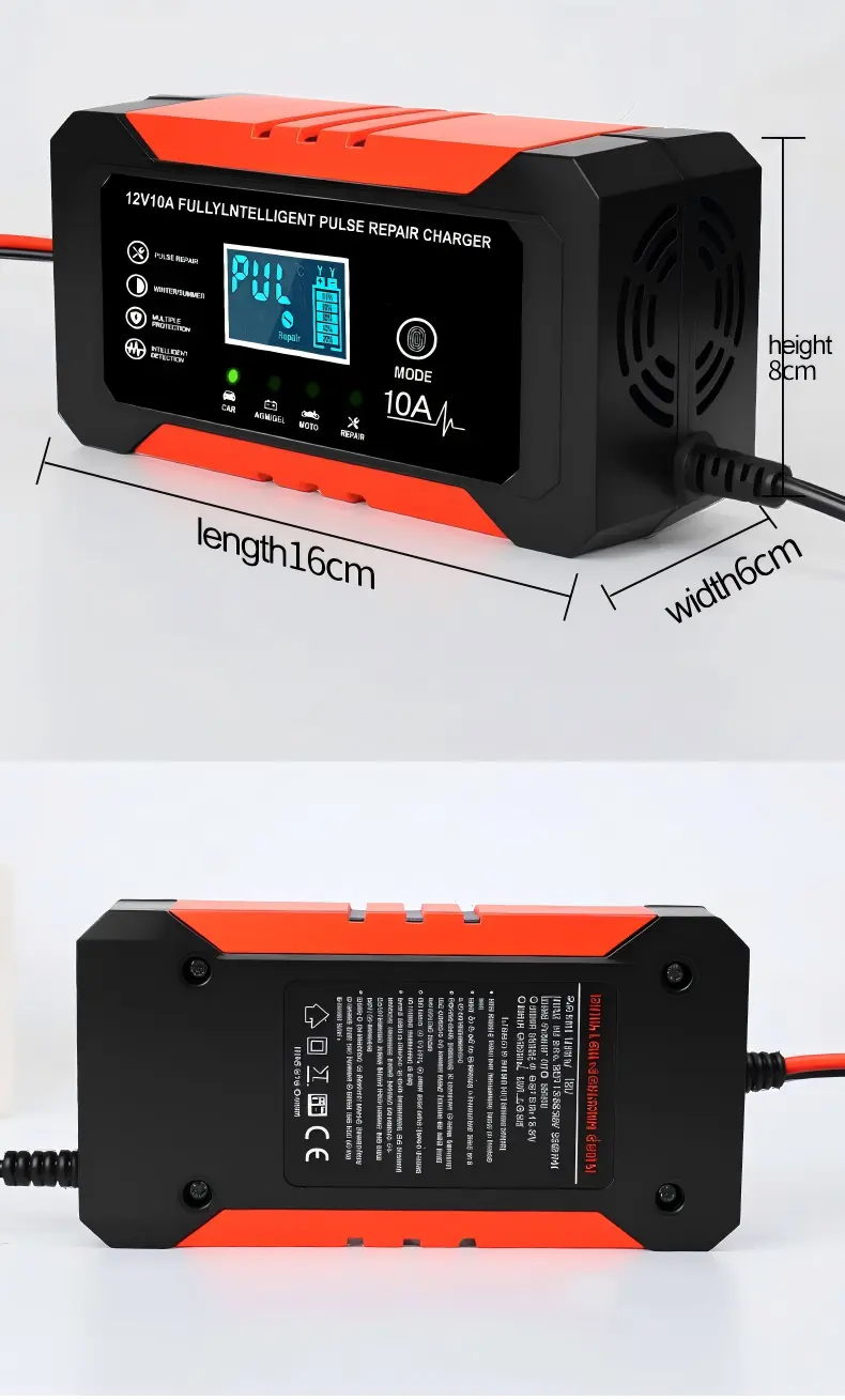 Utrustad med exakta tekniska specifikationer har denna intelligenta batteriladdare ett universellt inspänningsområde på 110~230V AC (50/60Hz), vilket säkerställer kompatibilitet med elnät över hela världen. Den ger en stabil 12V DC-utgång med en 10A laddningsström, och levererar konsekvent kraft för att snabbt ladda batterier – kapabel att fulladda ett 100Ah blybatteri på cirka 10 timmar, betydligt snabbare än vanliga 5A-laddare. Med en energieffektivitet på över 95 % minimerar den energislöseri, medan dess kompakta aluminiumhölje (170×90×50 mm, 1,0 kg) säkerställer bärbarhet och hållbarhet.