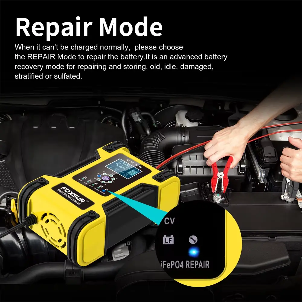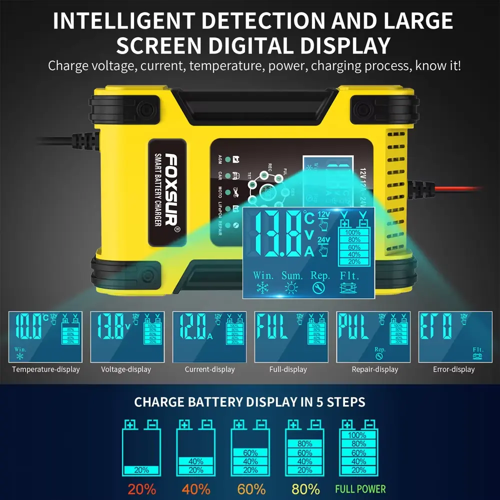 • 7-stegs laddare är lämpliga för de flesta batterityper, inklusive kalcium, gel AGM, LiFePo4, våta, blybatterier. De kan också hjälpa till att återställa urladdade och sulfaterade batterier.