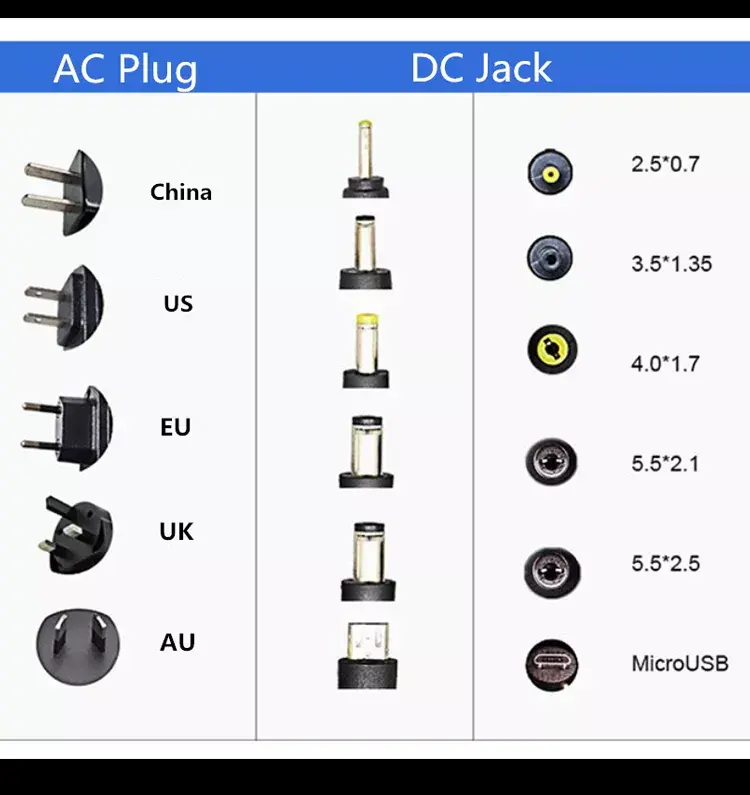 Kontakttyp: Standard DC-rörkontakt (vanliga storlekar inkluderar 5,5 mm×2,1 mm eller 5,5 mm×2,5 mm, anpassningsbar baserat på enhetskrav).