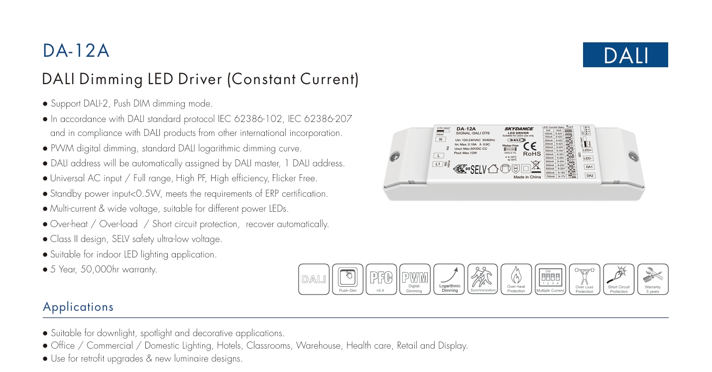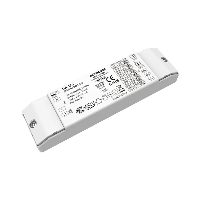STARWELL-fabrikens högkvalitativa 12W konstantström DALI dimbara LED-drivrutin är en högpresterande kärna för intelligenta belysningssystem, kompatibel med globala DALI-protokoll och 100-240V AC bred ingång. DALI dimbar LED-drivrutin levererar stabil konstant strömutgång (100-900mA justerbar) med ±5% noggrannhet, vilket säkerställer konsekvent ljusstyrka över armaturer. Med T-PWM-dimningsteknik uppnår den 0,0001%-100% ultradjup dimning utan flimmer, vilket uppfyller IEEE 1789-standarderna för ögonkomfort. Med PF>0,95 och upp till 87 % verkningsgrad minskar det energislöseri, medan IP20-skydd och -20~50℃ driftstemperaturområde passar bostäder, kommersiella och industriella scenarier.