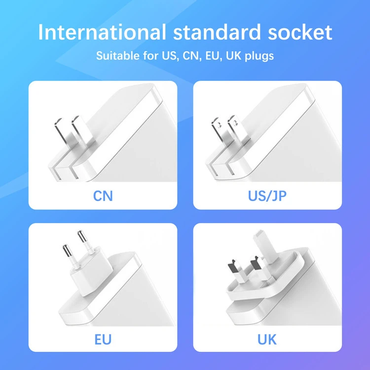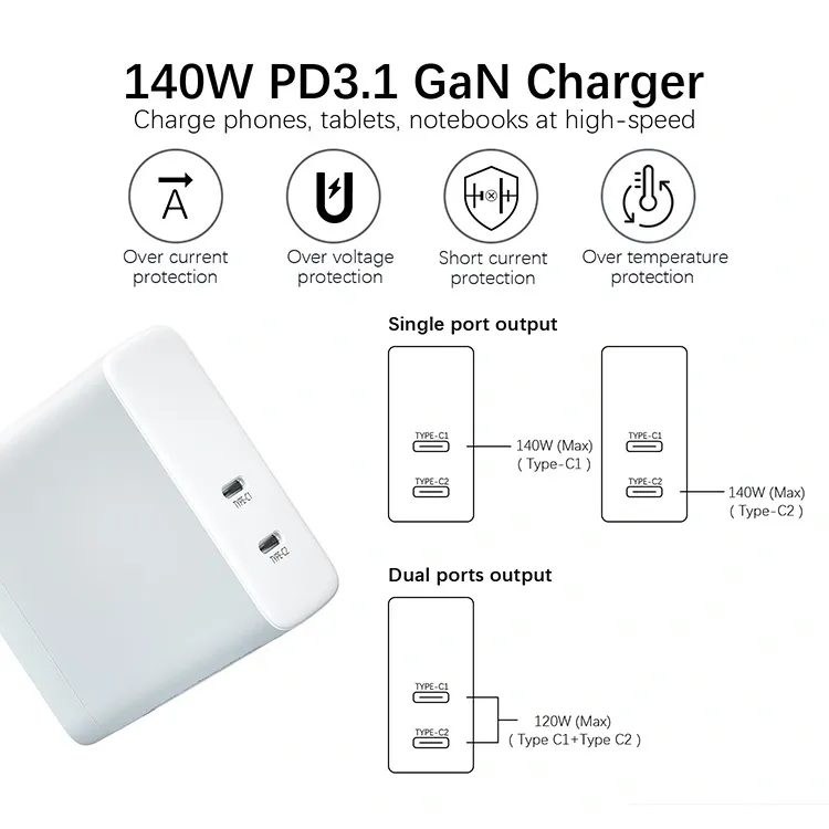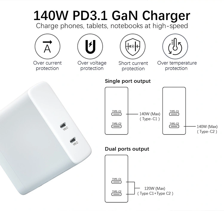 140W dubbel usb c-port PD Laddare USA-kontakt hopfällbar: Enkelporten kan ge upp till 140W effekt. Uteffekten med dubbla portar allokeras intelligent samtidigt. Vid laddning av en bärbar dator och en mobiltelefon samtidigt förblir effektiviteten oförändrad.