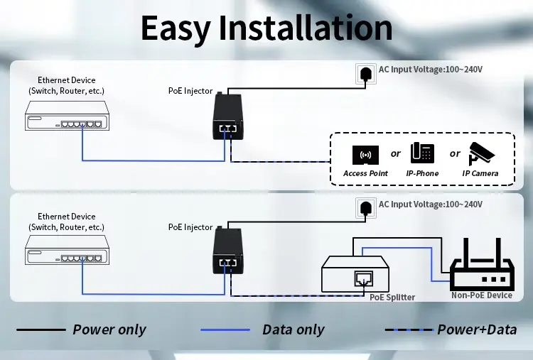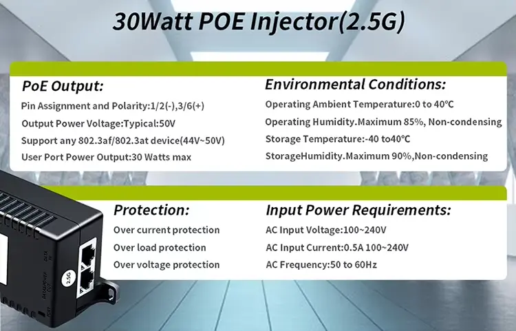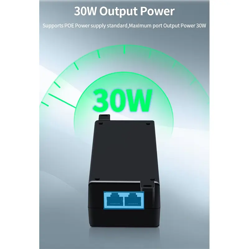 Denna 30W Poe-injektor stöder flera PoE-standarder, vilket gör den till ett flexibelt val för olika enheter.
