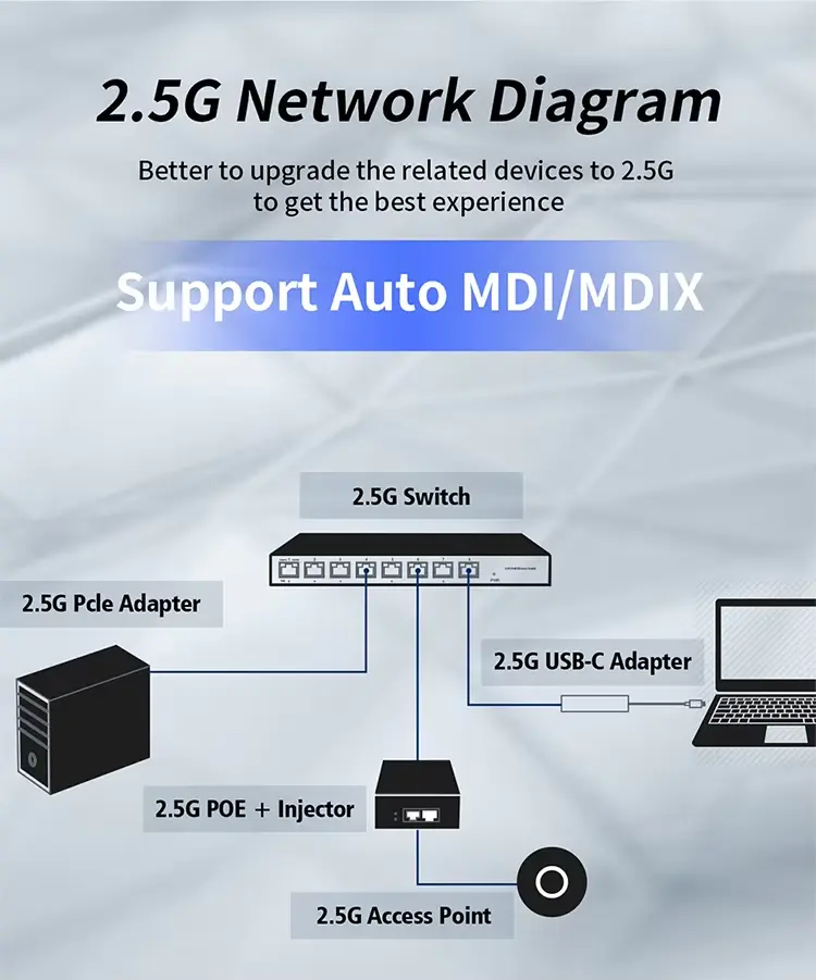 Håll dig före bandbreddskurvan med stöd för 2,5 Gbps datahastigheter, helt bakåtkompatibel med 10/100/1000 Mbps enheter.