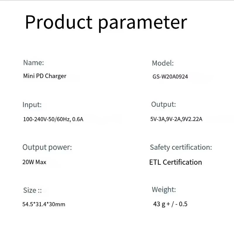 20W Japan version plug PD Charger Specifikation: