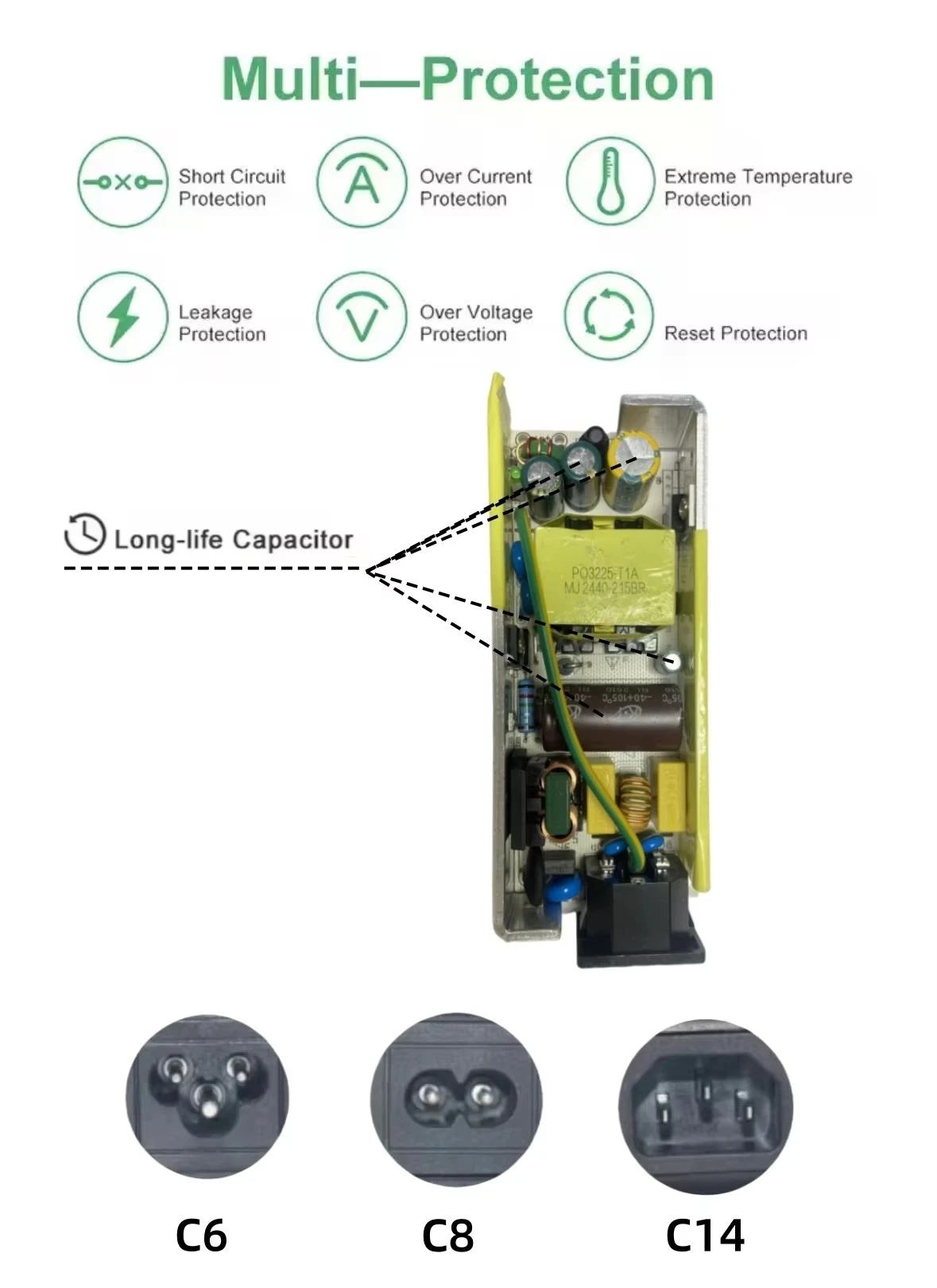 Omfattande säkerhetsskydd: Integrerade skyddsanordningar inklusive överströmsskydd (OCP), överspänningsskydd (OVP) och kortslutningsskydd (SCP) förhindrar skador på både adaptern och din värdefulla utrustning.