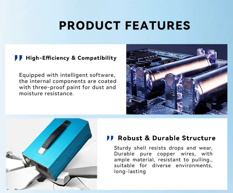 Den använder en intelligent fyrstegsladdningslogik: förladdning, konstant ström, konstant spänning och flytladdning, vilket effektivt förlänger batteriets livslängd samtidigt som det säkerställer full laddning. Inbyggda fullständiga skyddsmekanismer inkluderar överspänning, överström, övertemperatur, kortslutning och omvänd polaritetsskydd, vilket ökar driftsäkerheten och tillförlitligheten. Laddaren stöder automatisk avstängning vid full laddning, vilket befriar användare från manuell övervakning.