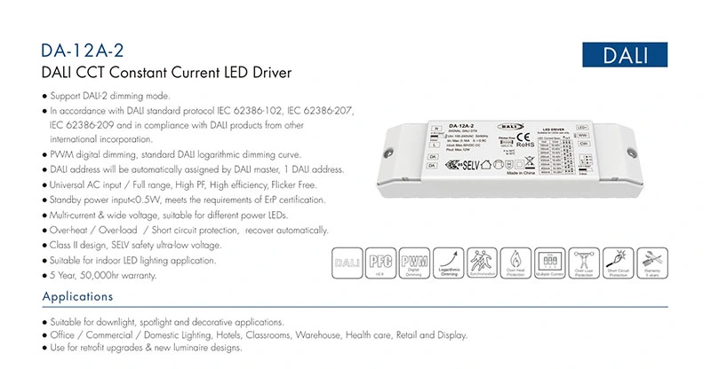Denna 30W konstantspänning DALI CCT dimbara LED-drivrutin uppfyller DALI-2 DT8-protokollet, stöder 0,1%-100% ultrasmidig flimmerfri CCT-dimning och en-adress dubbelkanalskontroll. Den paras sömlöst med alla vanliga DALI-masterkontroller för scenprogrammering och gruppstyrning, vilket perfekt uppfyller de exakta regleringskraven för professionell smart belysning.