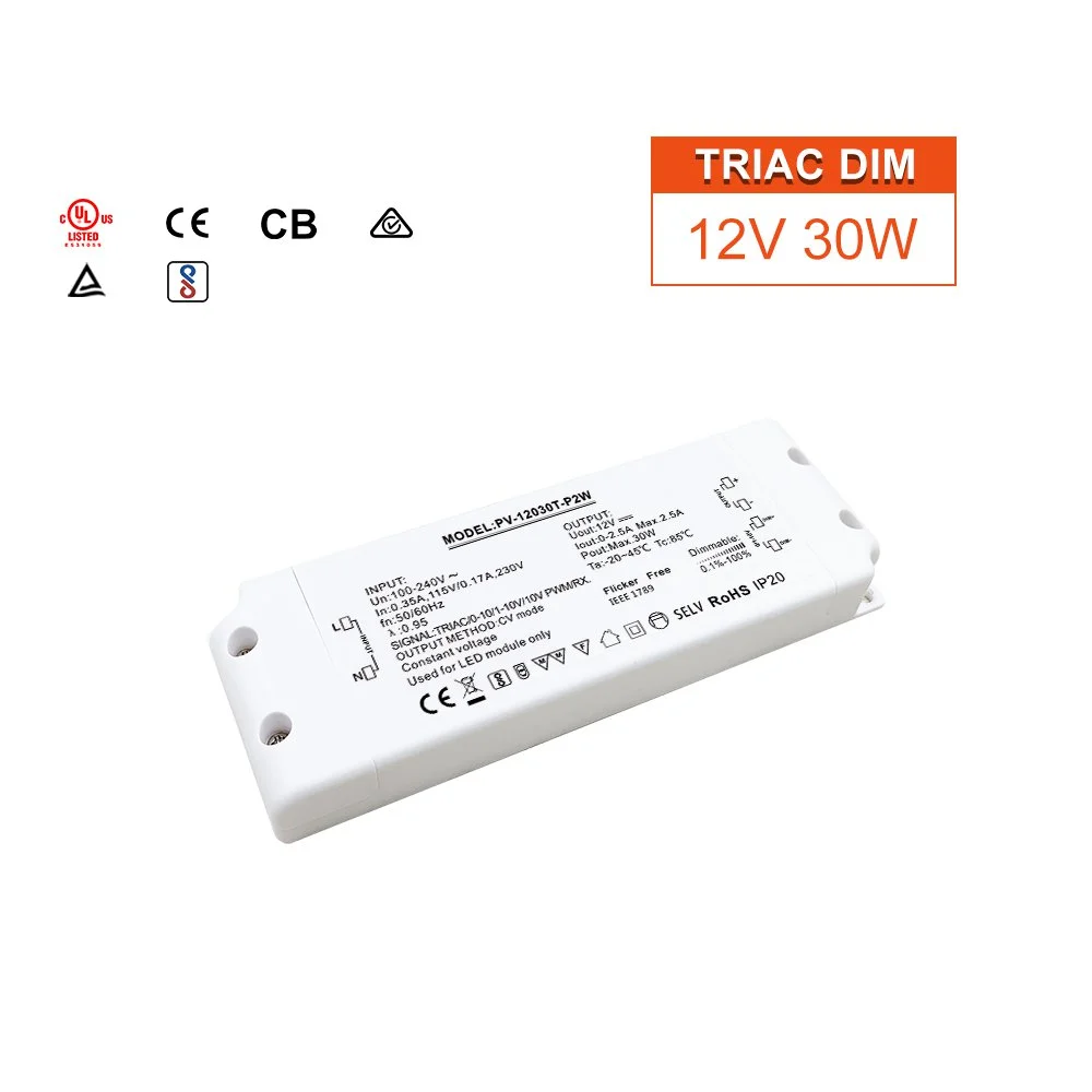 Som en stabil konstantspänningsströmförsörjning Triac-dimningsled-drivrutin ger den en konstant 12V DC-spänningsutgång. Denna 12V 30W triac dimbara strömförsörjning antar högkvalitativa komponenter och avancerad kretsdesign, vilket säkerställer stabil utspänning genom hela dimningsområdet och eliminerar i grunden flimmer från ljus. Det är en verkligt flimmerfri triac-dimande led-drivrutin för inomhusbruk. Dess icke-flimmande funktion skapar inte bara en bekväm och hälsosam visuell miljö utan skyddar också effektivt känsliga LED-ljuskällor och moduler, vilket förlänger belysningsarmaturernas totala livslängd.