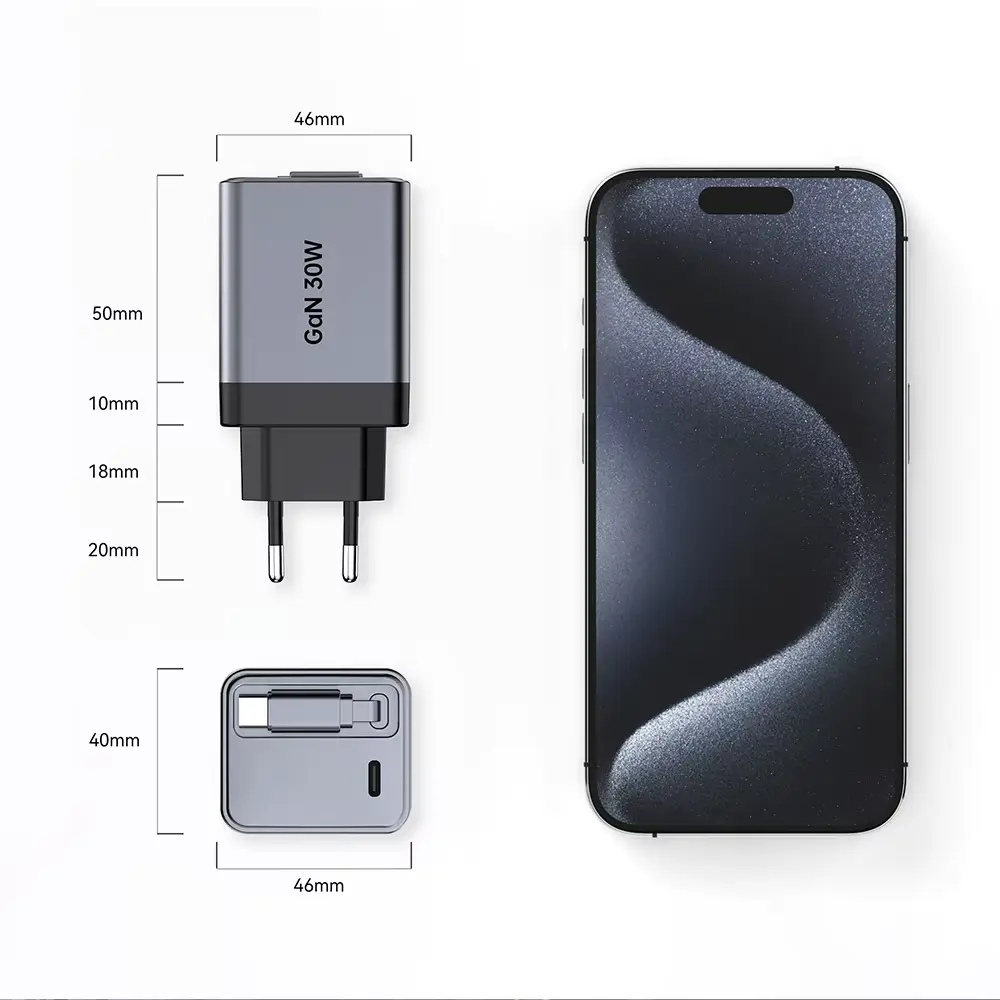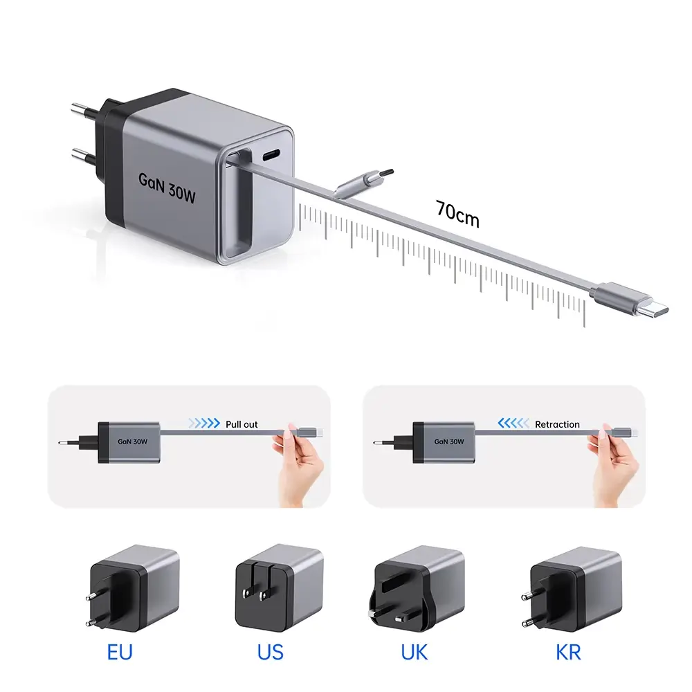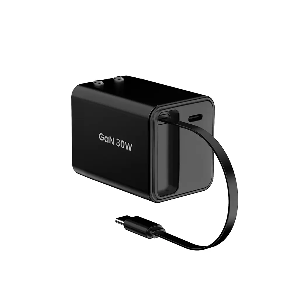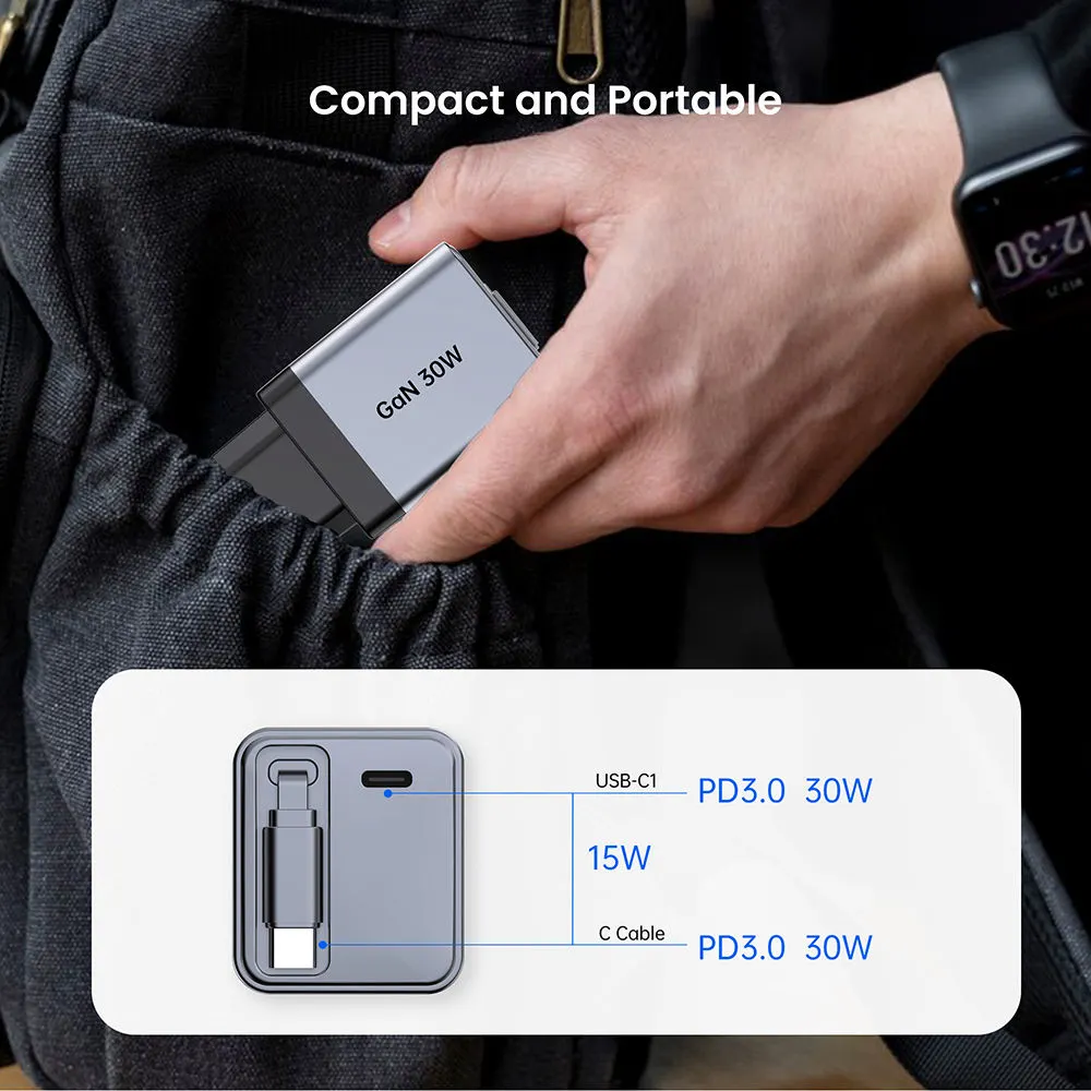 30W snabbladdare med indragbar typ C-kabels ultralätta design i fickstorlek gör den lätt att bära med sig. Det är det perfekta valet för hemmet, kontoret eller resor.
