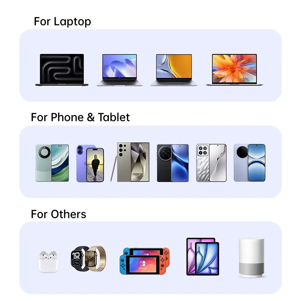 Denna 30W snabbladdare kommer med en självindragande laddningskabel. En försiktig dragning justerar längden och den dras automatiskt in i enheten när den förvaras. 3.Bred enhetskompatibilitet