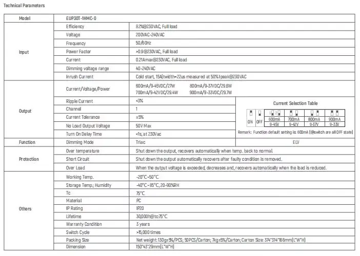 Som en professionell tillverkare och leverantör av led-drivrutiner i Kina, är vår 30W Triac-dimning LED Driver Constant Current en kraftomvandlingsenhet designad speciellt för medelstor till hög effekt LED-belysningssystem. Den använder avancerad konstantströmskontrollteknik för att säkerställa stabil drift av LED-pärlor vid märkström, vilket effektivt förlänger lampans livslängd och förbättrar ljuseffektivitetens konsistens. LED-drivrutinen med konstant strömavbländning är lämplig för belysningsscenarier med hög efterfrågan som kommersiell belysning, industriell belysning, utomhusstrålkastare och växtbelysning.