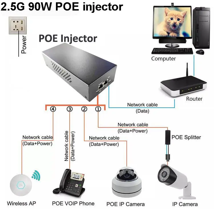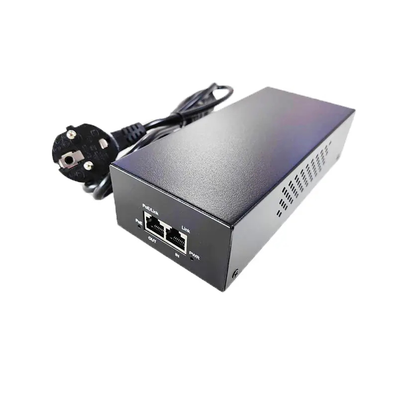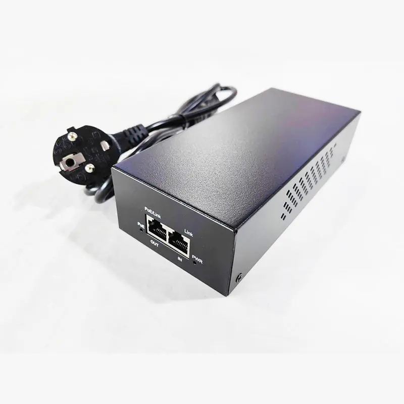 Starwell fabrikens 48V 90W PoE-injektor PoE-adapter, en högpresterande lösning designad för pålitlig ström- och dataleverans över Ethernet. Den här injektorn är helt kompatibel med IEEE802.3af/at/bt PoE++-standarder och säkerställer stabil 2,5G höghastighetsdataöverföring och kan driva enheter med hög efterfrågan som IP-kameror, trådlösa AP:er, nätverksväxlar och IP-terminaler. Dess kompakta, plug-and-play-design förenklar installationen i hem-, kontors- och industrinätverk, och erbjuder säker och effektiv PoE-strömförsörjning med minimal installation.