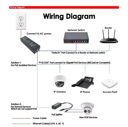 Ström- och dataintegration: Levererar stabil 48V ström och hela 1000 Mbps data över en enda Ethernet-kabel, vilket eliminerar extra kablar och eluttag för en renare distribution.