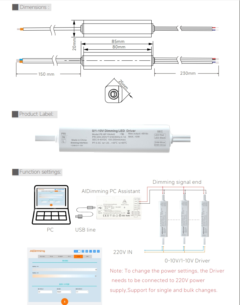 1. Innan du får åtkomst till dimningssignalen, kontrollera om styrsignalen är 0-10V eller 1-10V, och signal- och ströminställningarna kan ändras via AIdimming PC och programvara. Strömförsörjningen för att ändra parametrarna måste anslutas till 220V-strömförsörjningen, som kan ändras i omgångar.