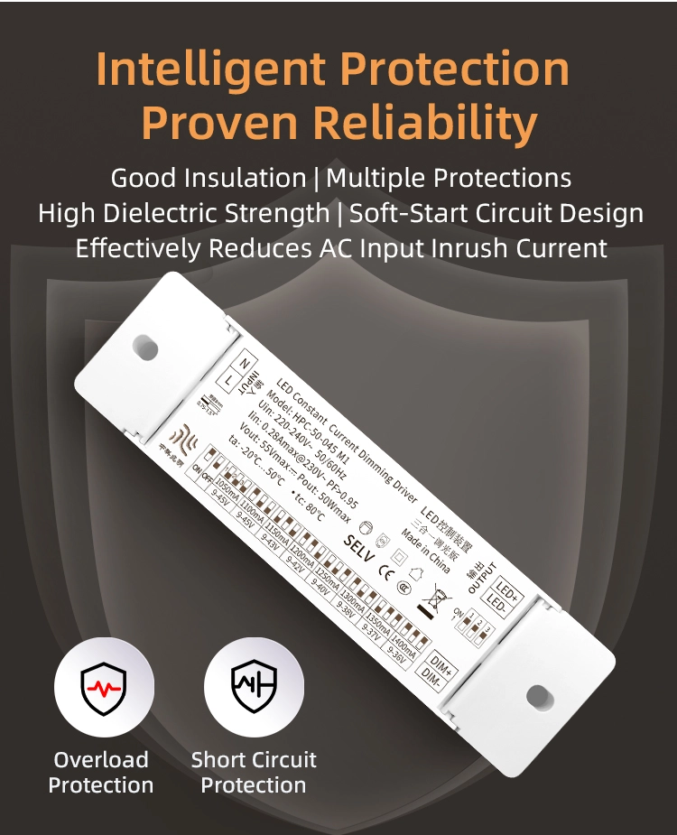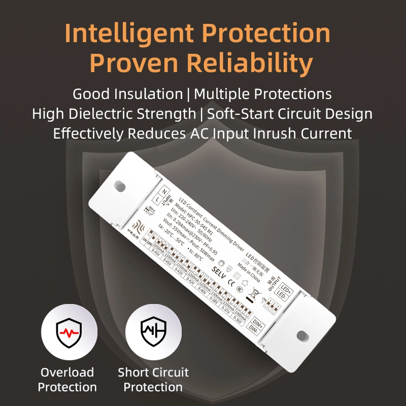 Multipelskyddsdesign: Byggd med fyra skyddsmekanismer: överspänning (skyddströskel ≥55V), överström (skyddströskel ≥0,18A), kortslutning och överhettning (skyddstemperatur ≥110℃). Den kan snabbt stänga av utgången vid onormala arbetsförhållanden för att skydda föraren och LED-ljuskällor från skador.