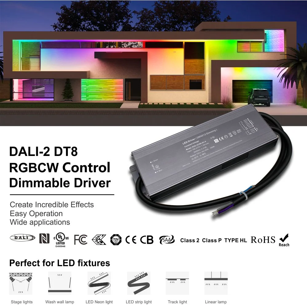 Dess kärndesign är inriktad på att möta de mest krävande installations- och applikationskraven. Strömförsörjningen antar ett utgångsläge med konstant spänning, vilket ger en stabil likspänning på 12V eller 24V, och är optimerad för att driva olika LED Strip-ljus och moduler. Imponerande är att samtidigt som den levererar en kraftfull drivkraft på 200 W, uppnår den en ultrakompakt storlek, vilket i hög grad sparar installationsutrymme i kopplingsdosor eller smala tak. Produktserien är flexibel och erbjuder olika kanalversioner från 1 till 5 kanaler: enkanalsversionen är avsedd för ren dimning, dubbelkanalsversionen styr självständigt kallt och varmt vitt ljus för att uppnå full-range CCT-justering, och femkanalsversionen är en kraftfull DALI konstant spänning RGB CCT dimbar 200W LED-drivrutin, som genererar och kan styra RGB-ljus i generöst och kallt färg samtidigt och kallt. färger och atmosfärer.