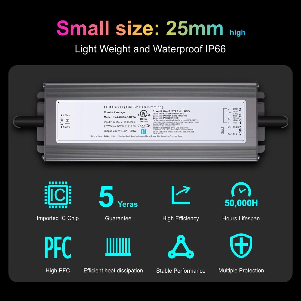 Den kvalitet och sinnesfrid vi lovar återspeglas i varje detalj. Produkten har erhållit UL-certifiering, uppfyller strikta internationella säkerhetsstandarder och levereras med en 5-års garanti för kvalitetssäkring. I ett nötskal, detta är inte bara en strömförsörjning; det är ett kraftfullt, pålitligt och flexibelt hjärta av ljusstyrning. Genom att välja denna äkta DALI 2 DT8 dimbara 200W LED-drivrutin väljer du en smart belysningslösning av professionell kvalitet som är framtidsinriktad.