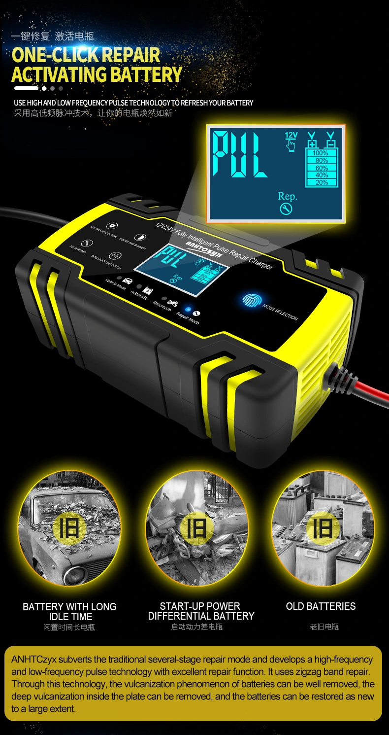· Pulsreparationsfunktion: Använder högfrekvent pulsteknik för att minska blysulfatkristallisering (sulfatering), vilket hjälper till att återställa förlorad kapacitet i åldrade eller underladdade batterier.