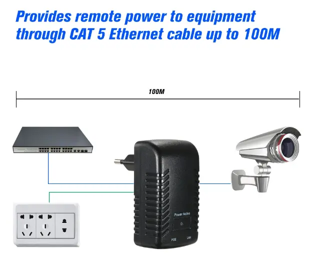 Konstruerad enligt 48V IEEE 802.3af-standarden, levererar denna icke-standardiserade väggmonterade Ethernet-adapter en stabil 15W uteffekt och stöder fullt ut de flesta POE-drivna IP-kameror, som vanligtvis kräver 15-25W (exklusive högeffekts PTZ-modeller). Den fungerar också tillförlitligt med IP-telefoner och andra enheter som är kompatibla med 802.3af eller 802.3at POE-standarder, och erbjuder bred kompatibilitet utöver övervakningsinställningar. Wall Plug POE Injector är byggd för stabil långtidsdrift och kombinerar kraft- och dataöverföring över en enda Ethernet-kabel, vilket minskar installationstiden och materialkostnaderna för nätverksprojekt för bostäder, kommersiella och säkerheter.