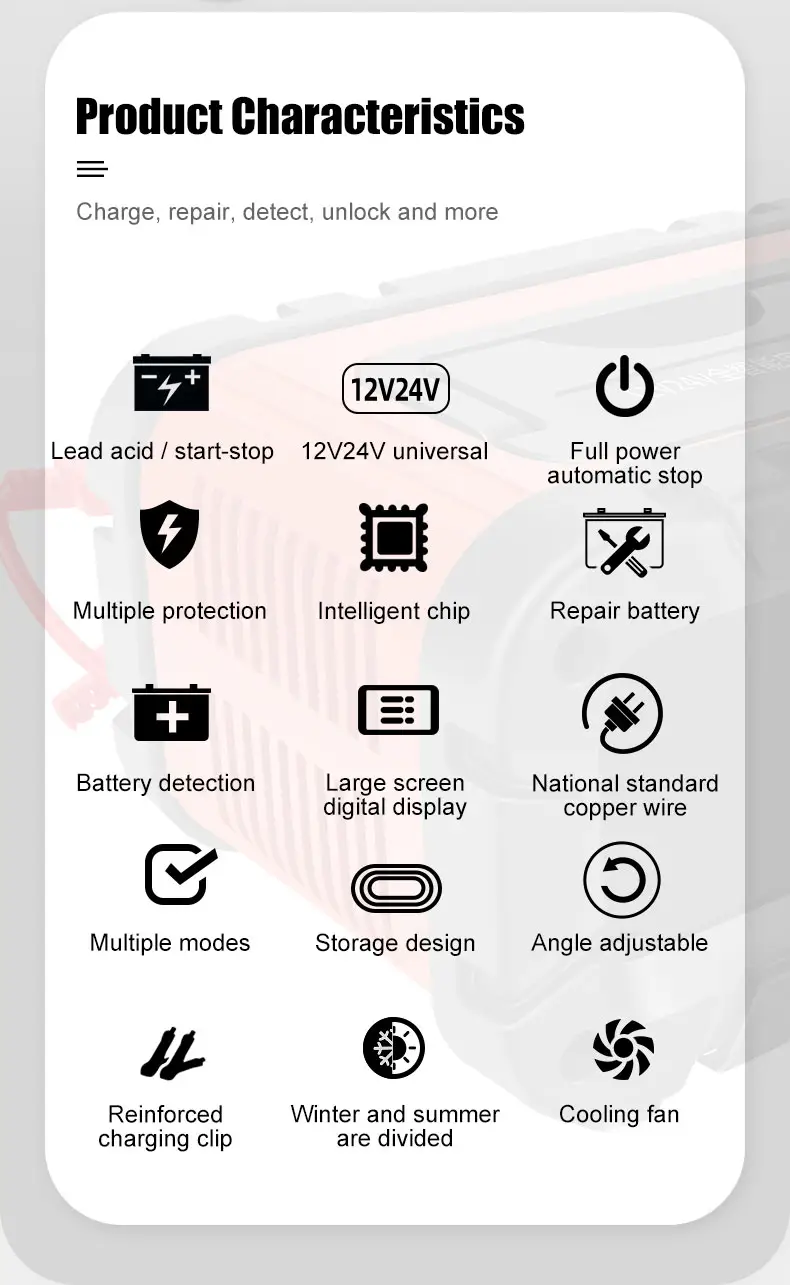 · Smart automatisk detektering: Identifierar automatiskt batterityp och tillämpar rätt laddningsläge