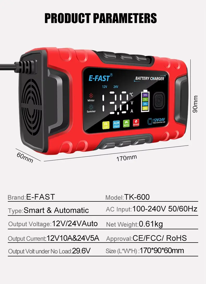 Högkvalitativ E-Fast TK-600 helautomatisk med Pulse Repair Technology 12V10A 24V5A blysyra lifepo4 batteriladdare för bil |